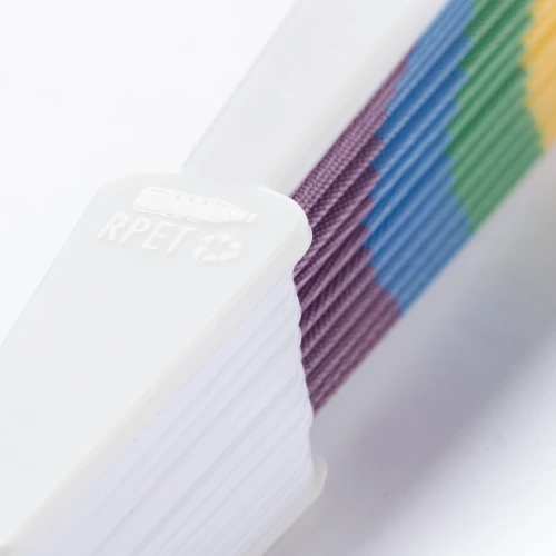 Abanico Rainbow con tela multicolor y varillas blancas en RPET. Todo un orgullo de abanico, con distintivo RPET en varilla e inyectado en molde. Presentación en caja individual blanca con ventana. El material RPET se elabora a partir de plástico reciclado, para así fomentar la reutilización de residuos plásticos y ayudar a la sostenibilidad del planeta.