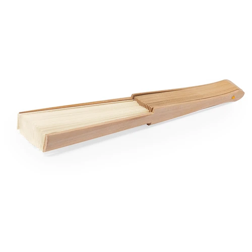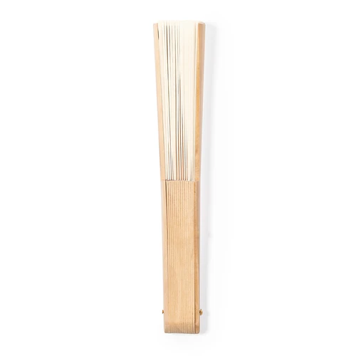 Abanico fabricado con varillas de madera y tela en algodón en combinación con el poliéster. De color natural y presentado en caja individual diseño kraft.