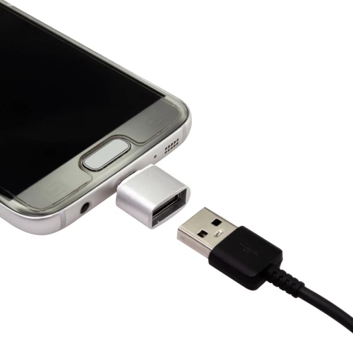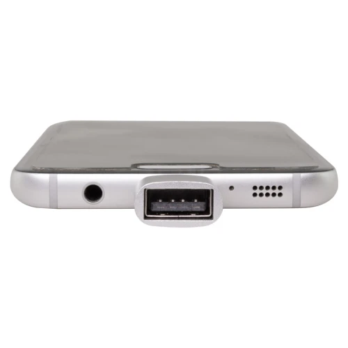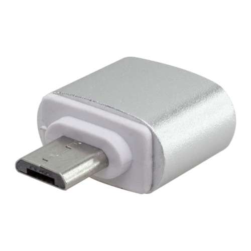 Adaptador USB-Micro USB (OTG-B), con cuerpo metálico plateado.