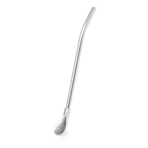 Práctico agitador con pajita en acero inox. Con diseño elegante y funcional, este accesorio es esencial para bebidas frías o calientes. Pajita integrada que permite absorber con facilidad y en el extremo inferior una práctica cucharilla con filtro. Presentado en una bolsa individual.
