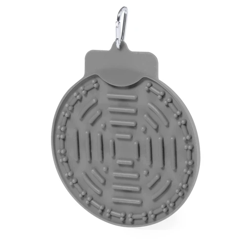 Almohadilla de mascotas para lamer fabricada en suave silicona. Con potentes ventosas para fijarla en superficies planas y que las mascotas puedan lamer su rugosa superficie. Mosquetón de transporte incorporado de fácil enganche. Presentado en una bolsa individual reciclada.