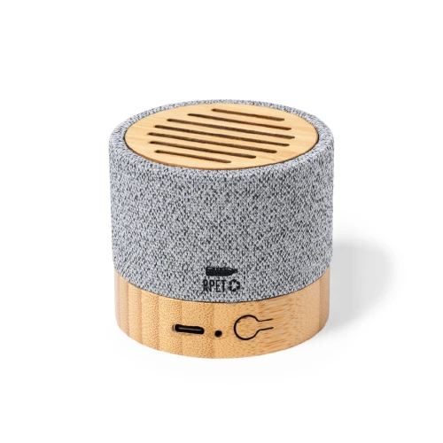 Compacto altavoz de línea nature y conexión Bluetooth. Carcasa fabricada en bambú y poliéster RPET, elaborado a partir de plástico reciclado, para así fomentar la reutilización de residuos plásticos y ayudar a la sostenibilidad del planeta. 3W de potencia, batería de 300 mAh y conexión Bluetooth 5.0. Incluye cable cargador Tipo C y manual de instrucciones en español e inglés. Con distintivo RPET y presentado en caja individual de diseño kraft.