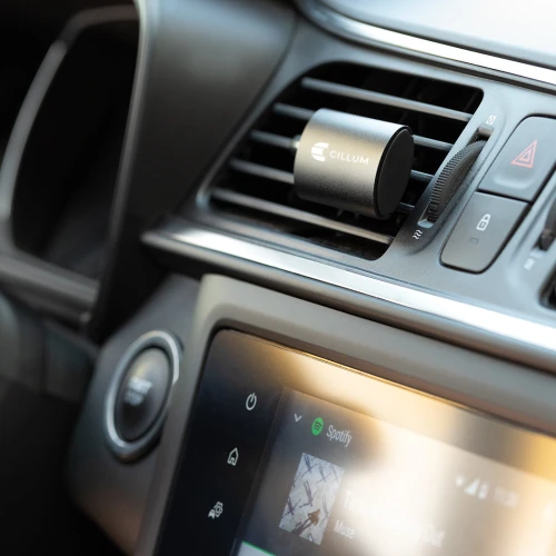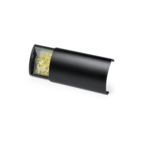 Ambientador para rejilla de coche en elegante diseño. Con frontal deslizante en aluminio granulado y resistente pinza para rejilla. Con bolitas de perfume de aroma limón y disponible en acabados plateado y negro.