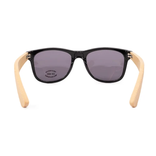 Deluxe Anteojos Lentes de Sol modelo "BAMBOO". Estuctura de plástico ABS con lentes de PVC ahumado y patas de madera de bamboo. Cuentan con protección solar certificada UV400. Presentación en bolsa compostable + caja de cartulina natural (kraft).