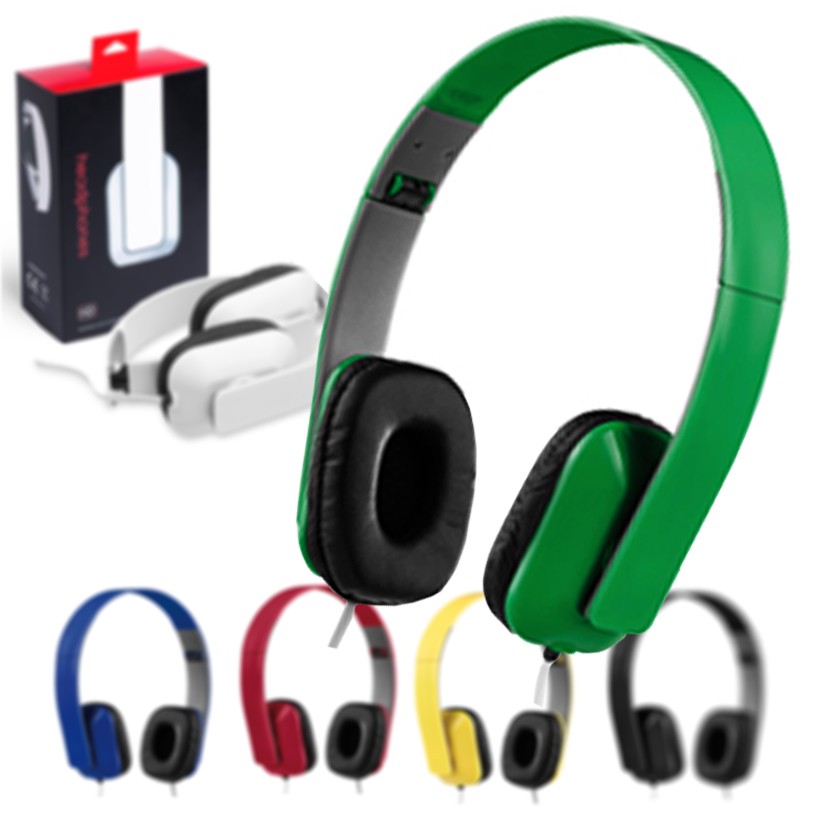 Auriculares de diadema plegables en desenfadados colores. Suaves y cómodas almohadillas de polipiel, con conexión jack de 3,5mm y presentados en atractiva caja de diseño.