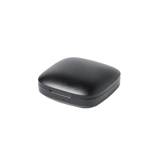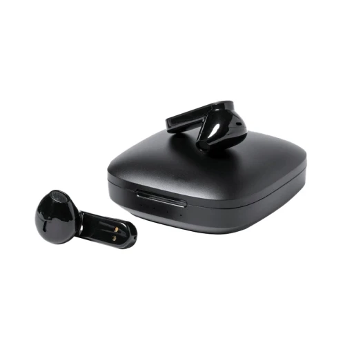 Auriculares inalámbricos estilo earbuds, fabricados en RABS. Cada auricular cuenta con un botón touch que permite subir y bajar el volumen, contestar y finalizar llamadas, reproducir y pausar música, cambiar a la siguiente o anterior canción.