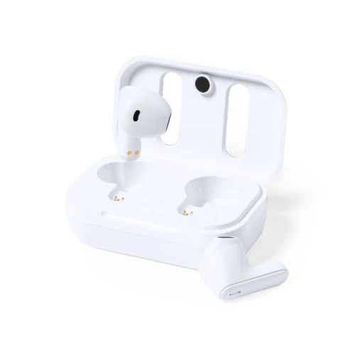 Auriculares intraurales Bluetooth, fabricados en RABS y en elegante color blanco, con la tapa de la base de carga forrada en cuero reciclado.Conexión Bluetooth 5.1, función manos libres y batería de 30 mAh. De diseño ergonómico, incluyen botón de control táctil integrado en cada auricular y luz LED de estado de carga. Base de carga a juego, con batería de 300mAh. Incluye cable cargador Tipo C y manual de instrucciones en español e inglés. Presentado en caja individual de diseño kraft.El material RABS o ABS Reciclado y el cuero reciclado proceden del reciclado de artículos al final de su vida útil. Los materiales reciclados empleados incorporan la certificación RCS, que garantiza el origen reciclado de los mismos.