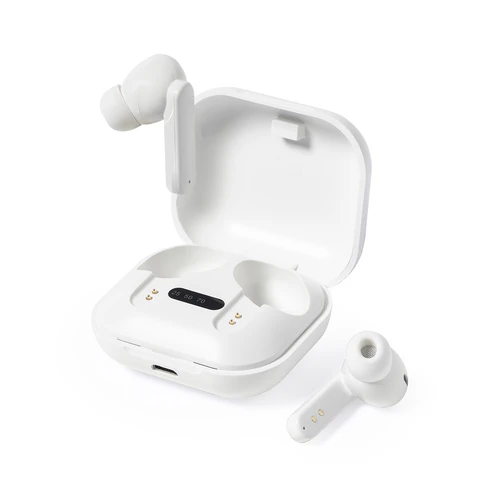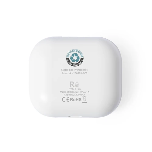 Auriculares intraurales de línea nature y conexión Bluetooth 5.0, con batería de litio y en elegante acabado de color blanco. Fabricados en ABS reciclado (RABS) y con certificación RCS, que garantiza el origen reciclado del mismo. De diseño ergonómico, incluyen botón de control integrado en el auricular, con base de carga a juego e indicador LED de estado de carga. Función manos libres y recargables, con cable micro USB incluido. Presentados en atractiva caja de diseño eco.