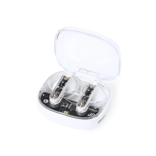 Auriculares intraurales en distintivo diseño transparente. Conexión Bluetooth 5.3 y gran autonomía . De diseño ergonómico, incluyen botón de control táctil integrado en el auricular, con base de carga a juego e indicadores de estado de carga. Función manos libres. Puerto de carga con entrada Tipo C (cable incluido). Presentados en caja individual de diseño kraft y en bolsa reciclada.