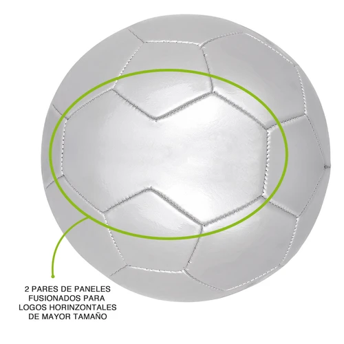 Balón de Fútbol N°5 de cuero sintético PVC 2.0mm de grosor, 32 paneles hexagonales (2 pares de paneles fusionados para logos horizontales de mayor tamaño), 2 capas, costuras a máquina, cámara de aire de goma. Incluye aguja infladora.