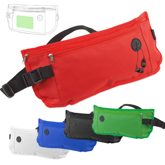 Riñonera en resistente poliéster 600D en variados colores. Con dos bolsillos de cierre de cremallera a juego, salida para auriculares y cintura con cierre de clic ajustable. Diseñada para actividades deportivas y de ocio. Con forro interior a juego.