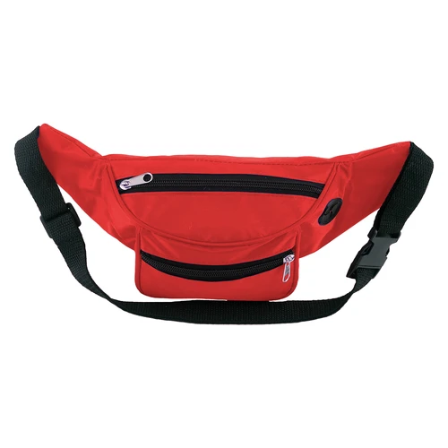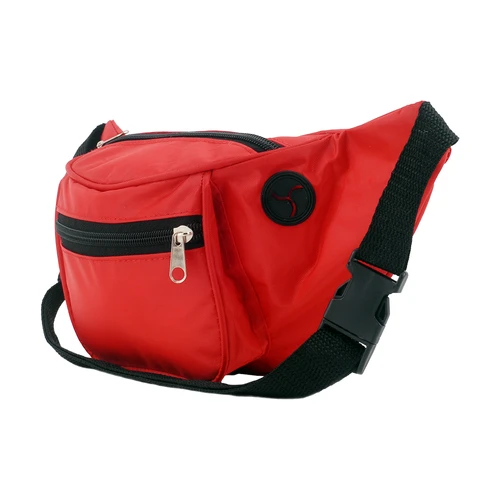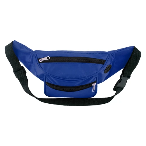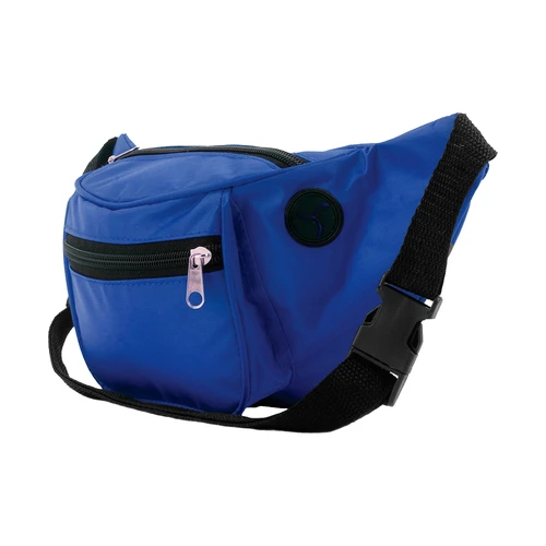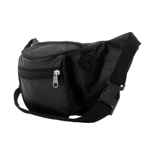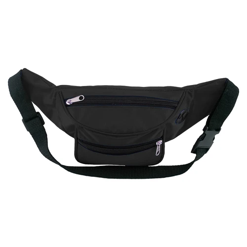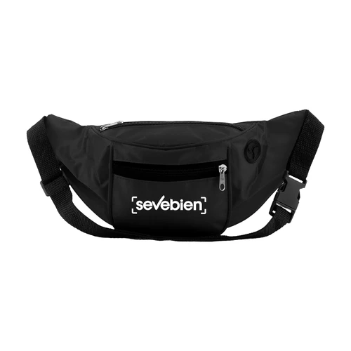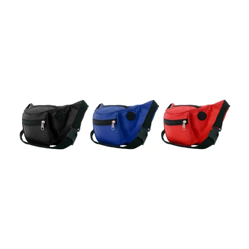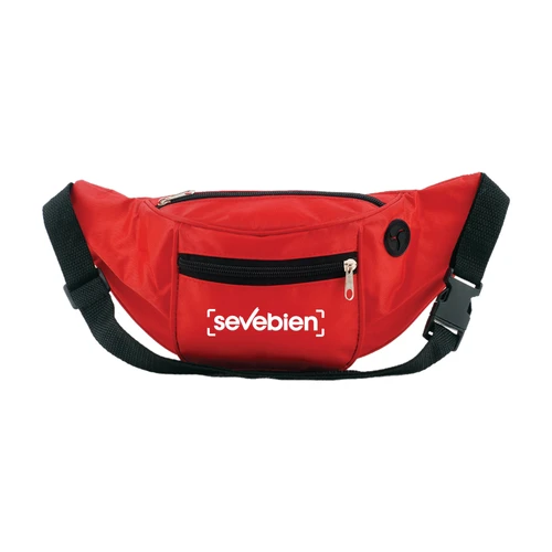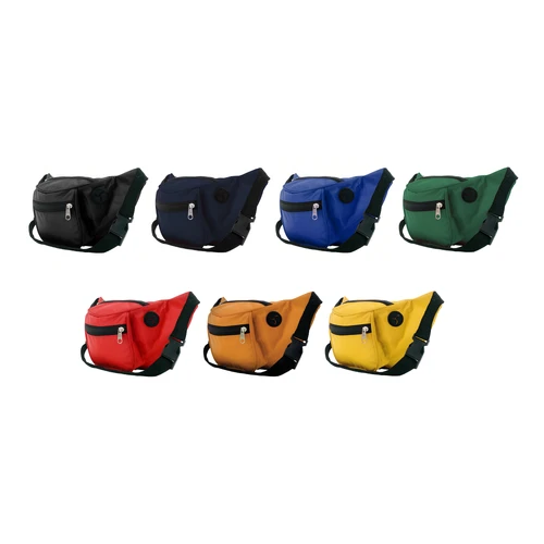 33 x 14,5 cm. Polyester 420D. Banano de 2 bolsillos. Salida para audífonos. Correa ajustable con herrajes plásticos. Cierres metálicos.
