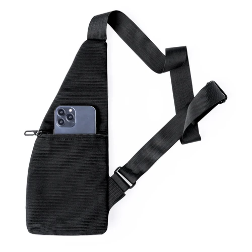 Bandolera confeccionada en poliéster 300D, ofrece múltiples bolsillos para una organización efectiva. Dos bolsillos principales se encuentran en la zona frontal y lateral, junto con dos bolsillos adicionales en la parte frontal y trasera. Destaca por una banda reflectante en el bolsillo central para mejorar la visibilidad. Se presenta de manera individual en una bolsa reciclada.