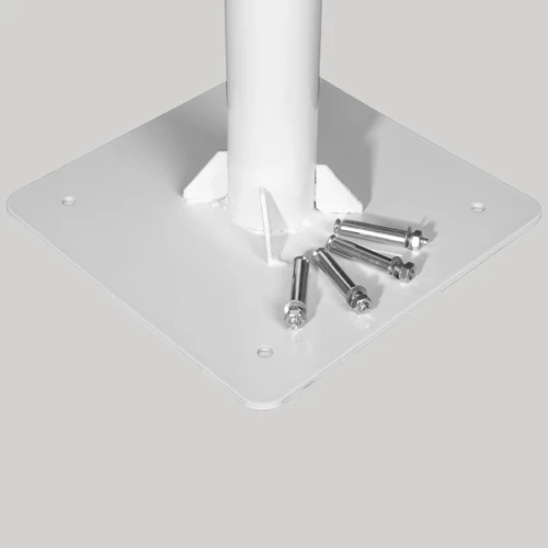 Base de Acero pintado blanco. Contiene orificios y 4 pernos para anclaje. Para quitasol P14 o quitasoles con asta de Ø60mm.