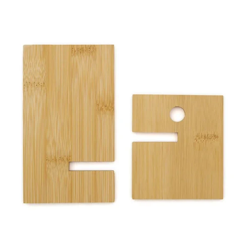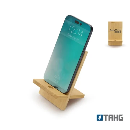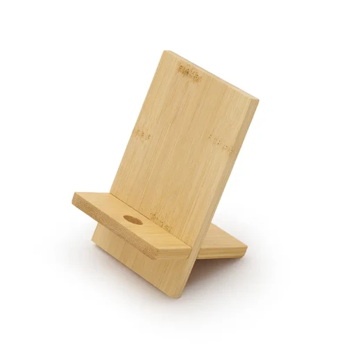 Soporte para teléfono fabricado en bambú. Incluye un orificio que permite el paso del cable facilitando la carga del dispositivo mientras está en uso.