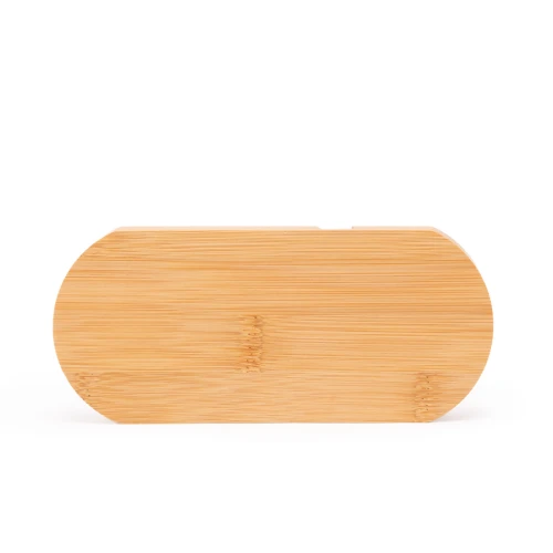Base Soporte de escritorio para Tablet y Celular. Fabricado en madera de Bamboo, con peso (g), espesor (1.7 cm), profundidad (1.4 cm) y ancho (1.3 cm) de orificios ampliados, de tal manera que puede soportar sin problema celulares actuales más gruesos (incluso algunos con carcaza) y tablets. Presentación en bolsa 100% compostable + caja de regalo de cartón color natural (kraft).