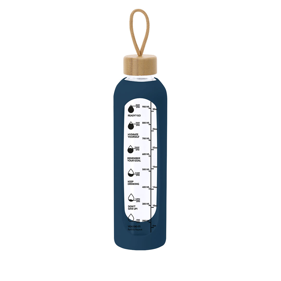 Bidón fabricado en cristal de 1L de capacidad, diseñado para fomentar una hidratación adecuada. Recubierto con funda de silicona que protege y proporciona un agarre cómodo y seguro.Incluye indicador de capacidad en litros y onzas, acompañado de frases motivadoras que inspiran a mantener una correcta hidratación diaria. Tapón, elaborado en bambú, incluye práctico cordón para facilitar su transporte. Libre de BPA. 1 L. Funda Silicona