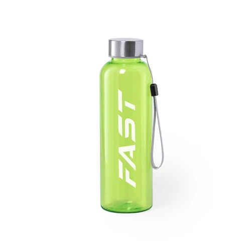 Bidón fabricado en RPET de 600ml de capacidad, libre de BPA. Tapón a rosca en acero inox, con cordón de transporte. Disponible en variada gama de colores.Elaborado a partir de plástico reciclado, para así fomentar la reutilización de residuos plásticos y ayudar a la sostenibilidad del planeta.