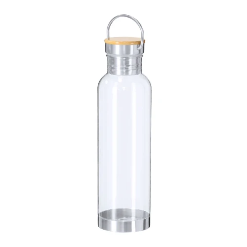 Bidón fabricado en RPET con capacidad de 800 ml. Cuerpo en RPET transparente. Tapón a rosca equipado con asa de trasporte en acero inoxidable con tapa en bambú y base en acero inoxidable. El material RPET se elabora a partir de plástico reciclado, para así fomentar la reutilización de residuos plásticos y ayudar a la sostenibilidad del planeta. Materiales como el Bambú fomentan la utilización de materias primas naturales reduciendo las emisiones contaminantes. Además, el bambú proviene de una planta de gran resistencia y versatilidad, con crecimiento y regeneración rápida, siendo una excelente alternativa al uso de madera tradicional.