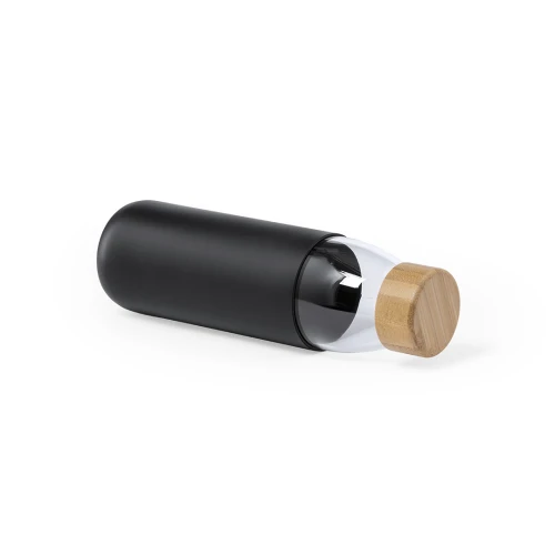 Bidón de línea nature de 540ml de capacidad. Fabricado con cuerpo de cristal y tapón a rosca de bambú. Incluye funda de silicona y viene presentado en caja individual de atractivo diseño.