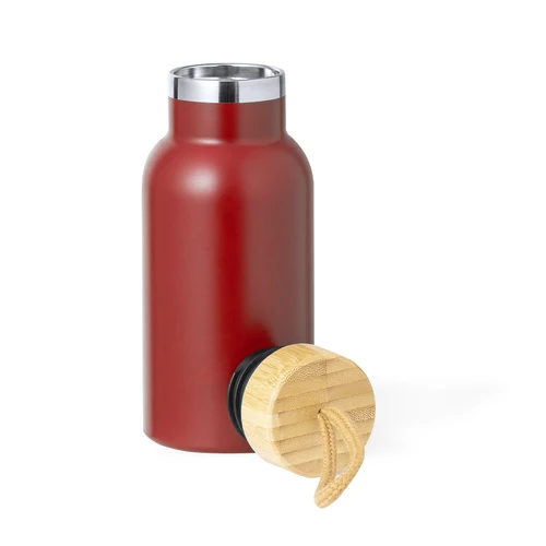 Bidón térmico de 350 ml de capacidad, fabricado en acero inox de doble pared. Incluye original tapón a rosca en bambú y asa para transporte en color natural. Disponible en variada gama de colores y presentado en caja individual de diseño kraft.