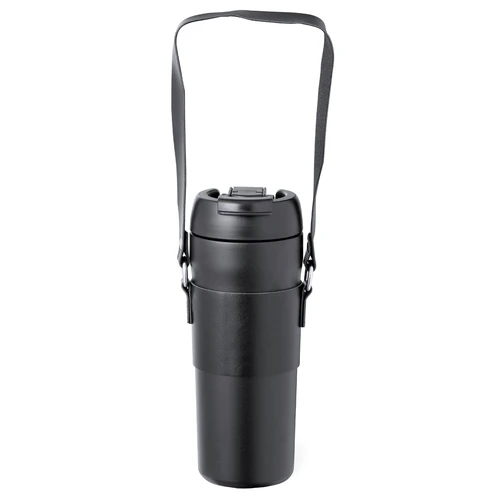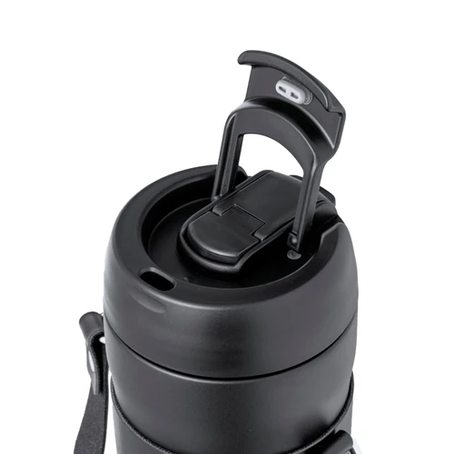 Elegante bidón térmico de 700 ml de capacidad, fabricado en acero inox de doble pared. Original tapón a rosca con dosificador en la tapa y boquilla para pajita, incluida. Con asa de transporte y agarrador a juego en polipiel. Presentado en caja individual de diseño kraft.