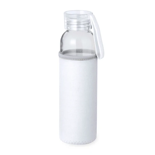 Bidón de 500 ml de capacidad. Cuerpo fabricado en cristal, con tapón a rosca y práctica asa de silicona para un fácil transporte. Incluye funda de soft shell a juego. Disponible en variada gama de colores y presentado en caja individual de atractivo diseño kraft.