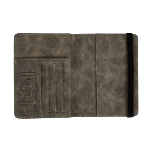 Billetera Porta-Pasaporte de eco-cuero, modelo "ORLY". Contiene 9 compartimentos interiores (4 ranuras porta-tarjeta + 2 bolsillos para memorias SIM card). Paredes exteriores acolchadas, con protección RFID anti-clonación de tarjetas. Cierre exterior elasticado negro, para protección de caída de pasaporte. Presentación en bolsa frozen y caja de cartón forrado negro opaco. Un fino regalo para que no te falte ningún documento en tu próximo viaje!