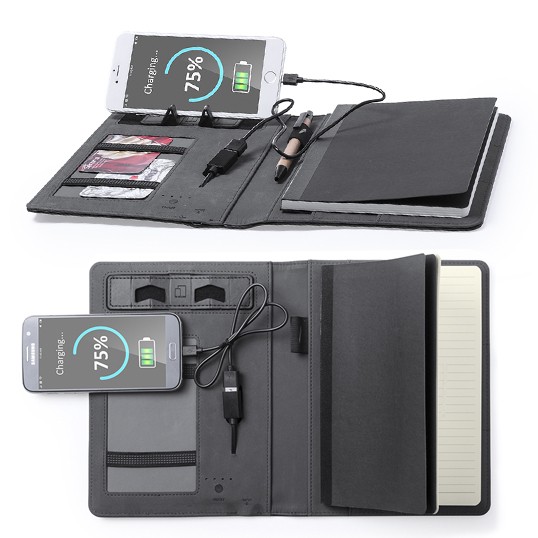 Elegante bloc de notas en polipiel con batería auxiliar externa de 3.000 mAh de capacidad de carga integrada. Incluye tarjetero, soporte para bolígrafo y soporte para smartphones y otros dispositivos móviles. El fácil acceso a la estación de carga mediante cable micro USB -incluido- hacen de este bloc el gadget perfecto para el mundo de los negocios y los estudios. Las capacidades mostradas en todas nuestras baterías auxiliares externas son reales, incorporando todas ellas baterías de grado A y no recicladas, con una vida útil de al menos 500 ciclos de carga y según normativa CE. Además, están fabricadas conforme a los estándares RoHS y en cumplimiento con los siguientes requisitos de seguridad: Sistema de protección contra sobrecarga del power bank. Sistema de protección contra descarga completa que proporciona una mayor durabilidad del power bank. Sistema de bloqueo para evitar cortocircuitos. Sistema de transferencia de carga constante, acorde con la capacidad del dispositivo de destino. Power Bank 3000 mAh. Salida USB. Entrada Micro USB. Bloc 65 Hojas