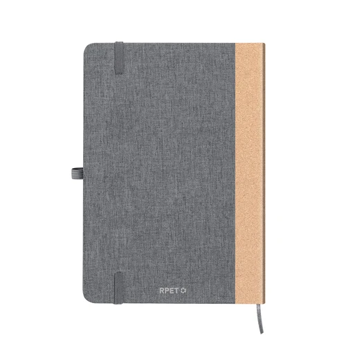 Bloc de notas con tapas rígidas fabricadas en RPET, con el lomo en corcho. Incluye interior con 80 hojas lisas, marcapáginas, elástico de cierre y soporte para bolígrafo a juego. logotipo RPET en contraportada y disponible en elegantes colores. Presentado en una bolsa individual de papel reciclado.El material RPET se elabora a partir de plástico reciclado, para así fomentar la reutilización de residuos plásticos y ayudar a la sostenibilidad del planeta.