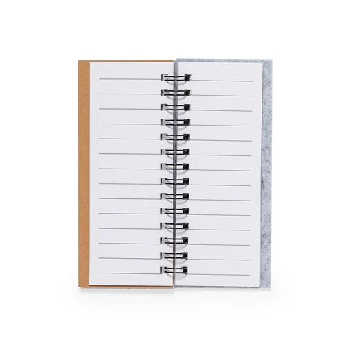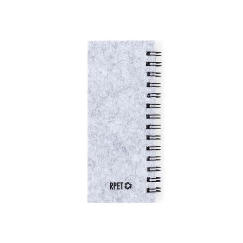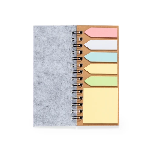 Bloc de notas fabricado en suave fieltro RPET. Con distintivo RPET en portada. Incluye:Bloc de anillas de 30 hojas blancas con disposición a una raya y distintivo reciclado por ambas caras.25 notas adhesivas medianas.125 mininotas adhesivas en varios colores.Presentado en bolsa individual reciclada.