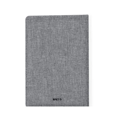 Bloc de notas fabricado en RPET 300D. Con tapas duras y bolsillo en tapa trasera con cierre de cremallera. Incluye 100 hojas a una raya, elástico de cierre y sujeta bolígrafo lateral. En color gris con elegantes detalles en negro. Logotipo RPET en contraportada.El material RPET se elabora a partir de plástico reciclado, para así fomentar la reutilización de residuos plásticos y ayudar a la sostenibilidad del planeta.
