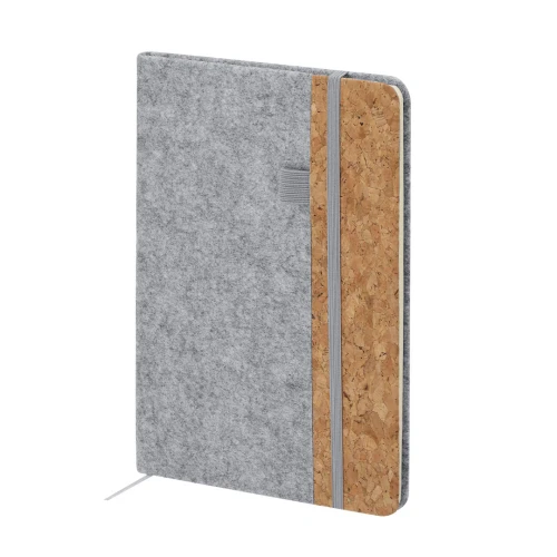 Bloc de notas con tapas rígidas elaboradas en combinación de fieltro RPET y corcho. Incluye 80 hojas a una raya con elástico de sujeción para bolígrafos en portada, banda elástica de cierre y marcapáginas a juego. Incliye distintivo RFELT.Elaborado con elementos vegetales para así fomentar la utilización de materias primas naturales y reducir las emisiones contaminantes.El fieltro RPET es fruto de la combinación del proceso de reciclaje de materiales plásticos junto con la técnica milenaria de fabricación del fieltro, dando como resultado un material de eco-tendencia que, además de ser de origen reciclado, también se convierte en reciclable.