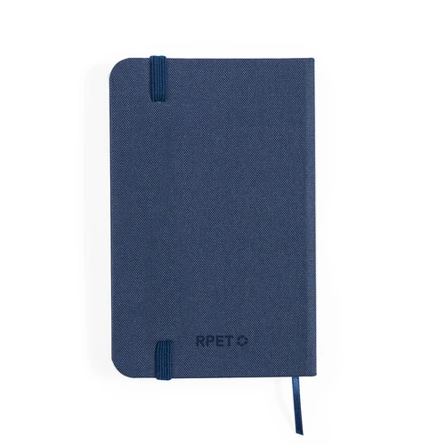 Bloc de notas con tapas rígidas en RPET 300D. Incluye 100 hojas con disposición a una raya, elástico de sujeción y marcapáginas de tela a juego. Disponible en amplia gama de colores. Logotipo RPET en parte trasera. Presentado individualmente en bolsa reciclada.El material RPET se elabora a partir de plástico reciclado, para así fomentar la reutilización de residuos plásticos y ayudar a la sostenibilidad del planeta.