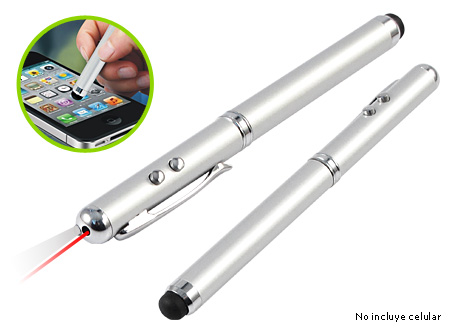 Bolígrafo metálico multi-función 4 en 1. Incluye bolígrafo, linterna LED, puntero láser y NUEVO puntero "Touch-Screen" para pantallas táctiles. Presentación en estuche de aluminio. Escritura Azul.