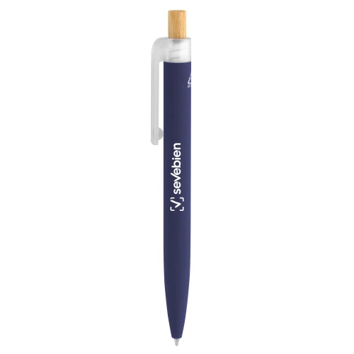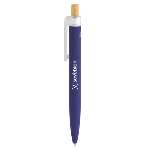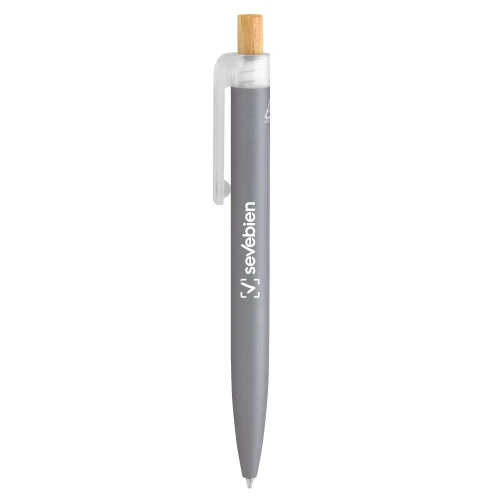 Fusiona lo moderno, elegante y ecológico.Bolígrafo retráctil. Cuerpo de aluminio en diferentes colores, acabado mate engomado, muy suave al tacto. Botón pulsador de bambú. Clip plástico transparente con terminación frosty. Medidas: 1,6 x 13,4 cm.