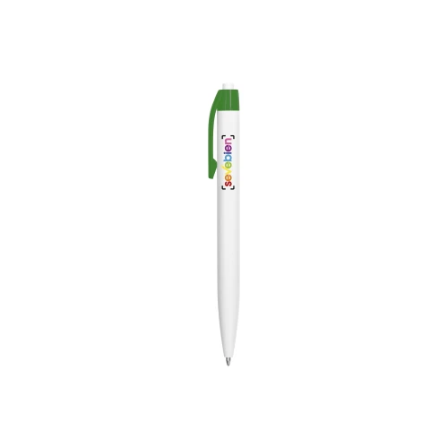 Plástico. Bolígrafo con cuerpo y pulsador de color blanco y clip en color. Tinta negra.