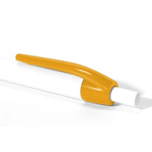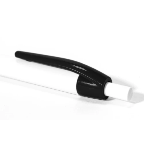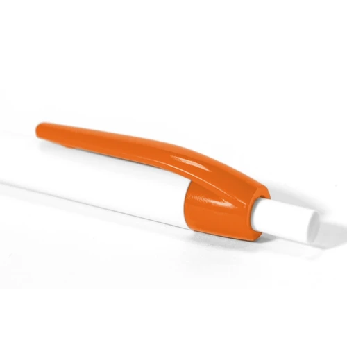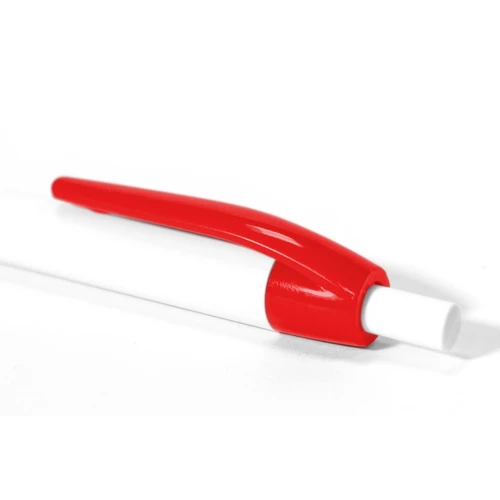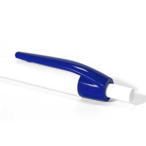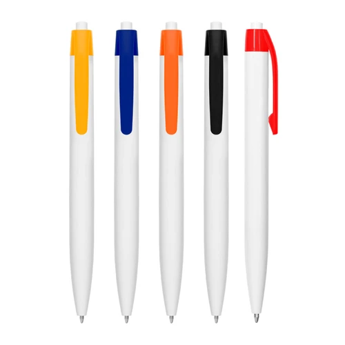Plástico. Bolígrafo con pulsador. Cuerpo plástico de color blanco y clip de color. Tinta azul