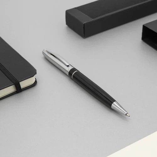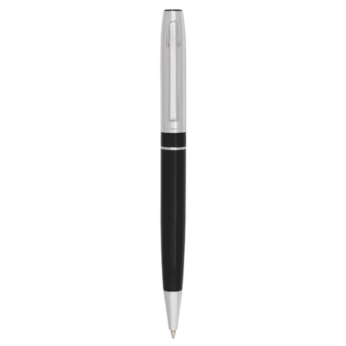 Bolígrafo con apertura giratoria. Cuerpo color negro. Tambor superior, clip, anillo y puntera color plata. Destape plata en la parte superior e inferior.