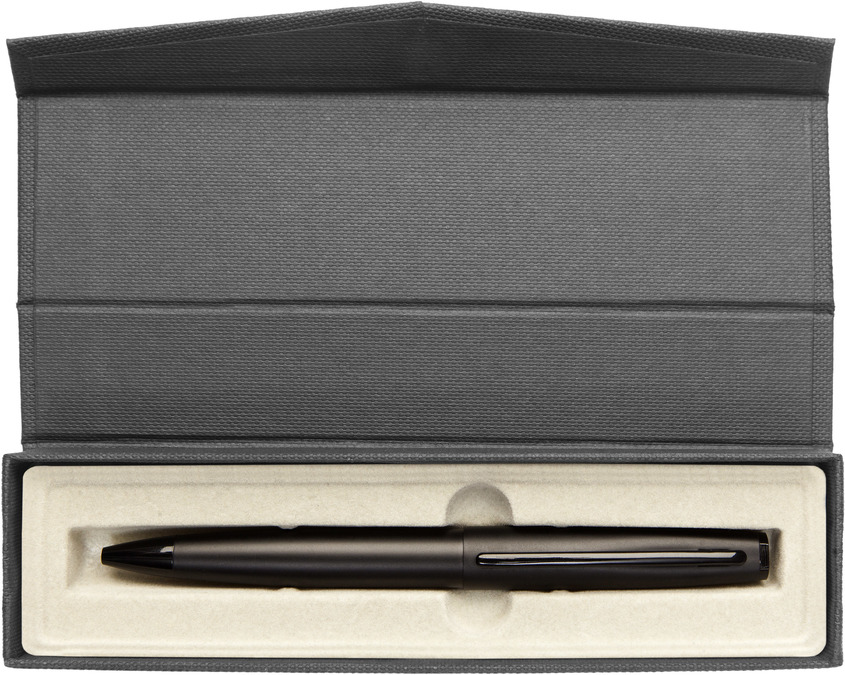 Metal. Cuerpo metálico mate. Clip de metal y punta plástica. Apertura giratoria. Tinta azul. Decape electroplateado en la parte superior. Presentación en estuche con cierre magnético.