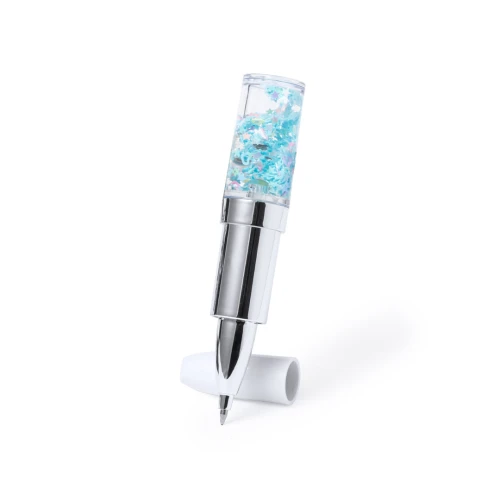 Original bolígrafo en forma de pintalabios, con líquido interior en colorido diseño. Con capucha y en tinta azul.
