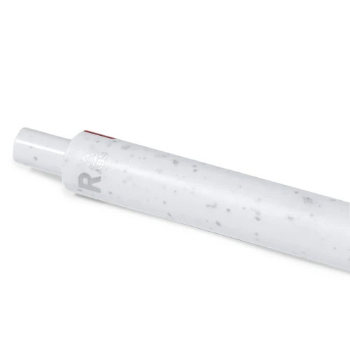 Bolígrafo de mecanismo pulsador fabricado en ABS reciclado. Con clip en vivos colores y cuerpo de suave acabado en color blanco sólido. Distintivo ABS reciclado en la parte superior del bolígrafo. En tinta azul.