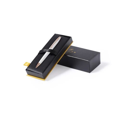 Bolígrafo Cross con mecanismo retráctil, de distinguido diseño bicolor blanco con elegantes toques de oro rosa. Cuerpo metálico en suave acabado y original clip con logotipo. Presentado en elegante estuche individual en color negro, con logotipo de la marca e interior en suave antelina a juego. En tinta negra.