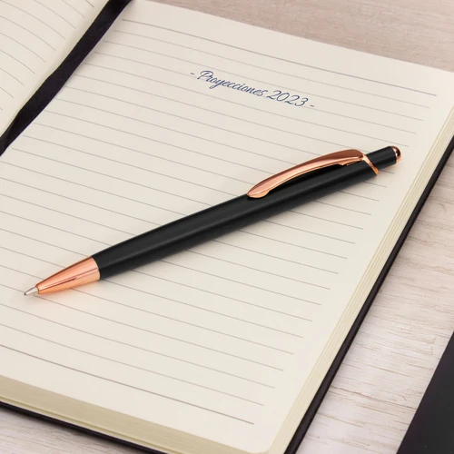 Metal. Cuerpo de aluminio, acabado engomado color negro, muy suave al tacto. Bolígrafo retráctil. Clip, puntera y detalles metálicos color cobre. Decapa color cobre (grabado exclusivo en nuestro taller). Tinta Azul.