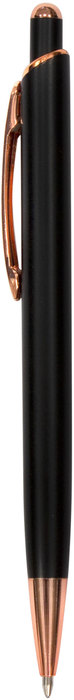 Metal. Cuerpo de aluminio, acabado engomado color negro, muy suave al tacto. Bolígrafo retráctil. Clip, puntera y detalles metálicos color cobre. Tinta Azul. Decapa color cobre.