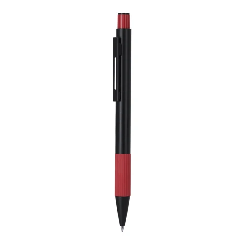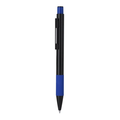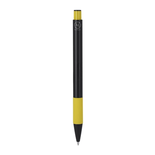 Bolígrafo con cuerpo en Aluminio Reciclado. Empuñadura acabado gomoso con textura. De mecanismo pulsador, de cartucho jumbo y con tinta azul. Incluye distintivo Aluminio reciclado.