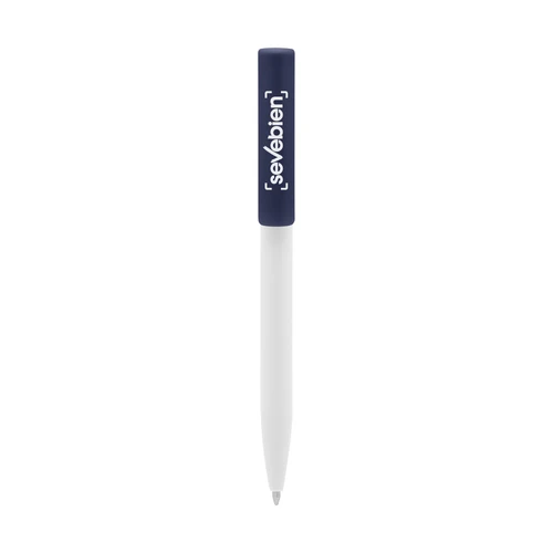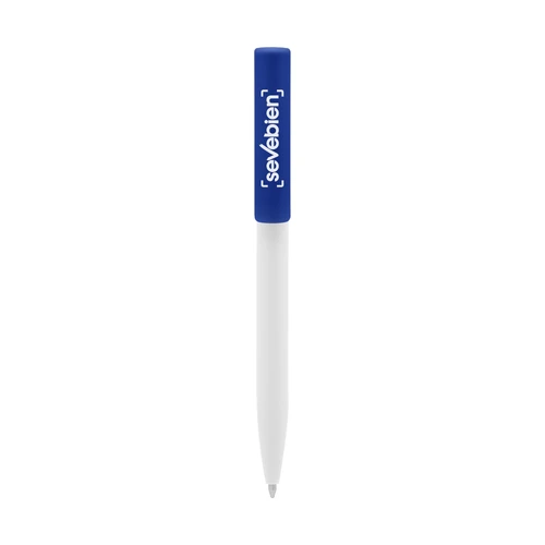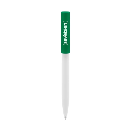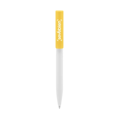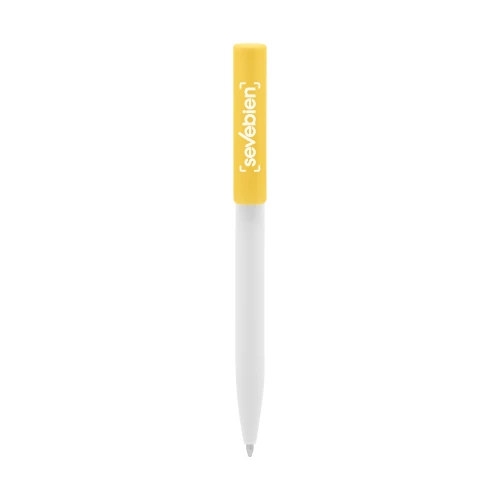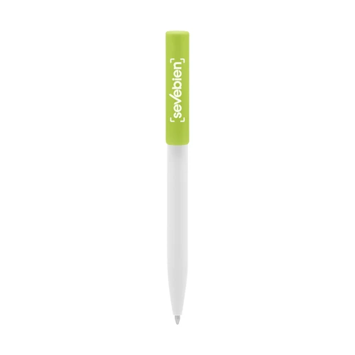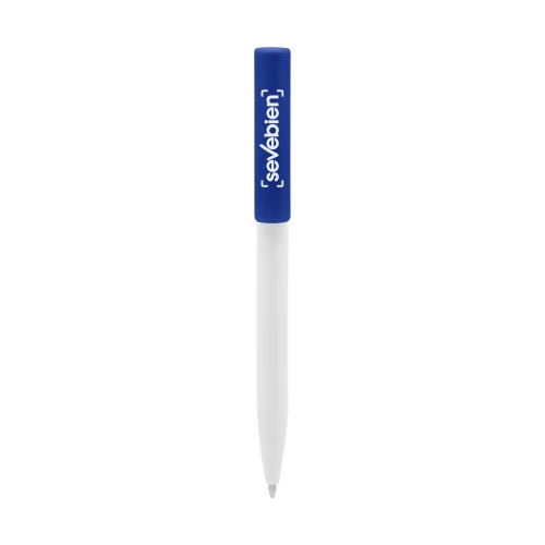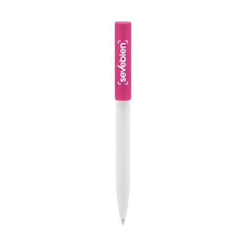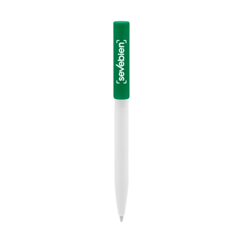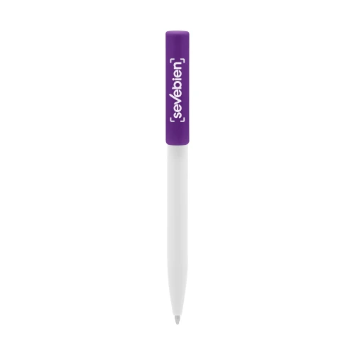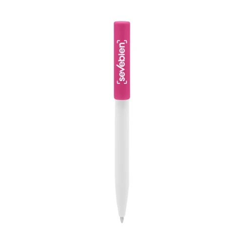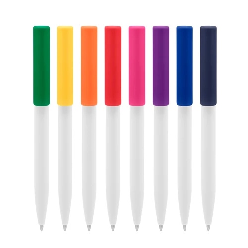 Plástico. Cuerpo blanco y clip de diferentes colores. Bolígrafo retráctil. Clip plástico de colores. Tinta negra. Sistema de botón push para destapar. Amplia área de impresión.