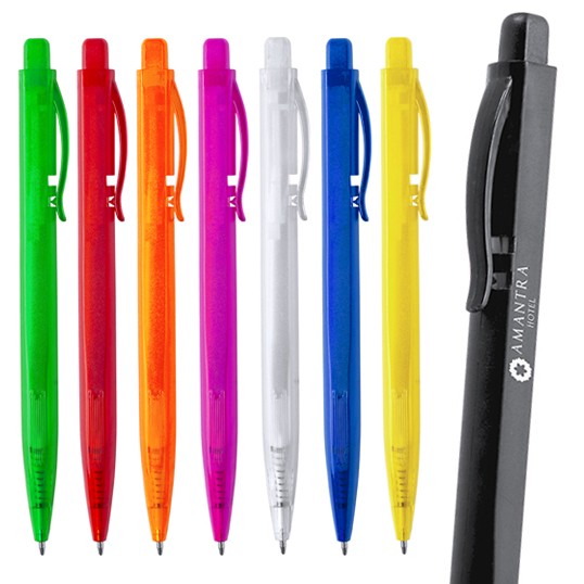 Original bolígrafo con cuerpo rectangular de acabado translúcido monocolor. Con mecanismo pulsador, original clip y disponible en extensa gama de colores. Tinta azul.