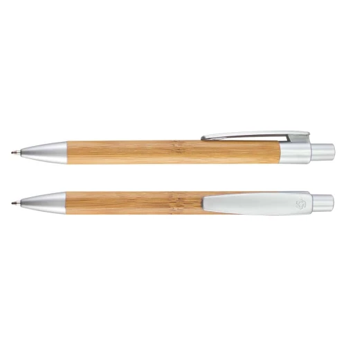 Bolígrafo de madera de Bamboo, con terminales satinados. Refill plástico parker type. Escritura azul. Presentación individual en Estuche de Cartón reciclado.