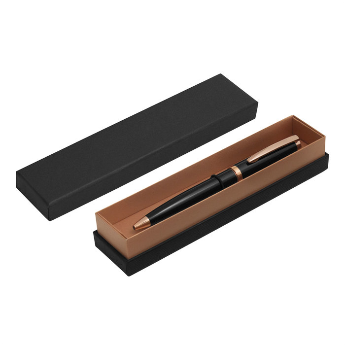 Metálico. Cuerpo color negro laqueado. Puntera, clip y anillo metálico en rose gold. Apertura giratoria. En la parte superior destape electroplateado. Tinta azul. Presentación en caja de regalo color negra, con detalle rose gold metalizado en su interior.